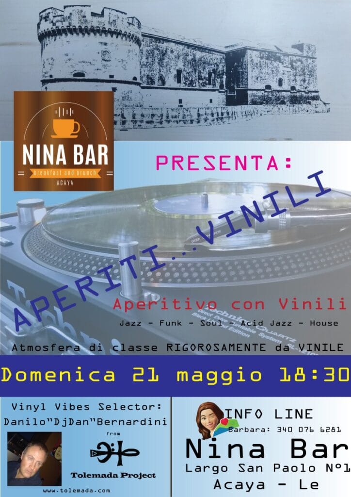 “Aperiti …Vinili” è il nome dell’evento in programma domani 21 maggio al Bar Nina di Acaya (Le), Largo San Paolo 1. Inizio alle 18.30, la musica è, rigorosamente da vinile, a cura del deejay Danilo “Dj Dan” Bernardini (progetto Tolemada), che renderà ancora più allettanti gli aperitivi del bar.