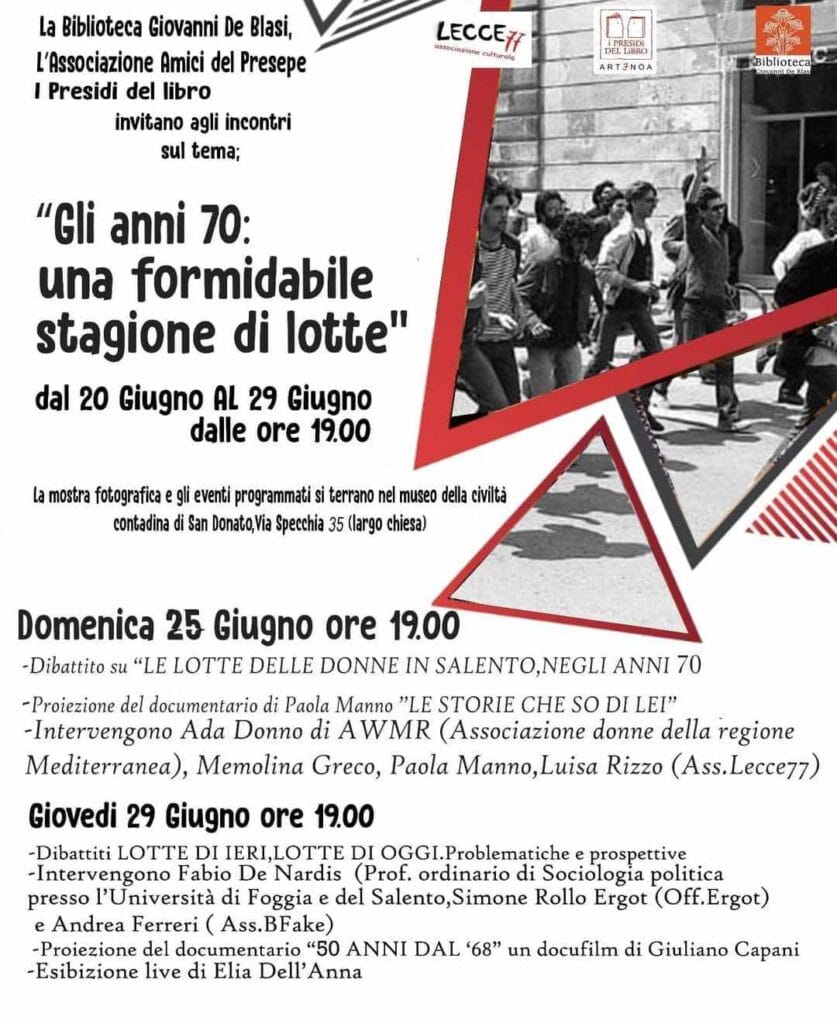 L’incontro vedrà gli interventi di Fabio De Nardis, ordinario di sociologia politica presso le Università di Foggia e del Salento, di Simone Rollo Ergot (Officine Ergot) e di Andrea Ferreri (associazione B.Fake). Seguirà la proiezione del docufilm di Giuliano Capani “50 anni dal ’68” e l’esibizione musicale live di Elia Dell’Anna. La manifestazione che si conclude stasera, è incentrata sulla mostra fotografica delle lotte e manifestazioni politiche degli anni 70 nel Salento .La manifestazione è organizzata da Biblioteca Giovanni De Blasi, Associazione Amici del Presepe, I Presidi del libro.