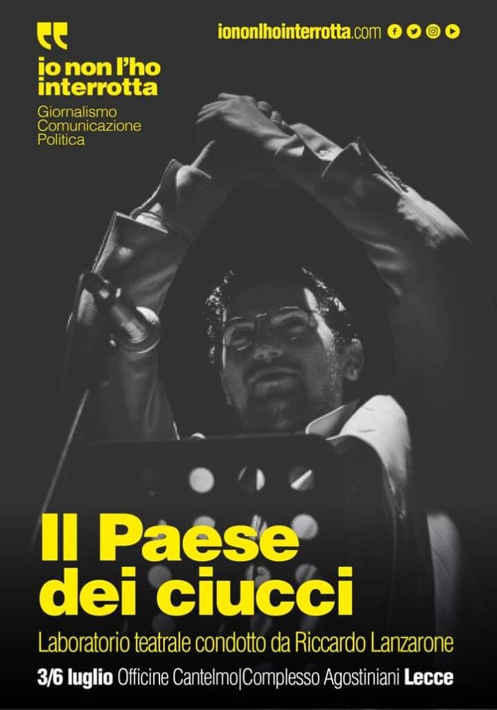 Dal 3 al 6 luglio il laboratorio teatrale condotto dall’attore, autore e regista Riccardo Lanzarone anticiperà e aprirà la nona edizione di “Io non l’ho interrotta”. La rassegna di giornalismo e comunicazione politica, dal 6 al 9 luglio, sarà ospitata dal Complesso degli Agostiniani di Lecce.Il Paese dei Ciucci è una riflessione sulla “politica” e sul nostro rapporto con essa. Una ricerca sull’iconografia di uomini e donne di governo e di partito: come li ricordiamo, come li vediamo o come li vorremmo. Ogni partecipante costruirà il suo personaggio politico. La sua biografia privata: come si chiama, da dove viene, quanti anni ha, che mestiere fa? E la sua biografia politica: quale partito o coalizione rappresenta, quale ideologie sostiene, quante volte ha cambiato casacca?