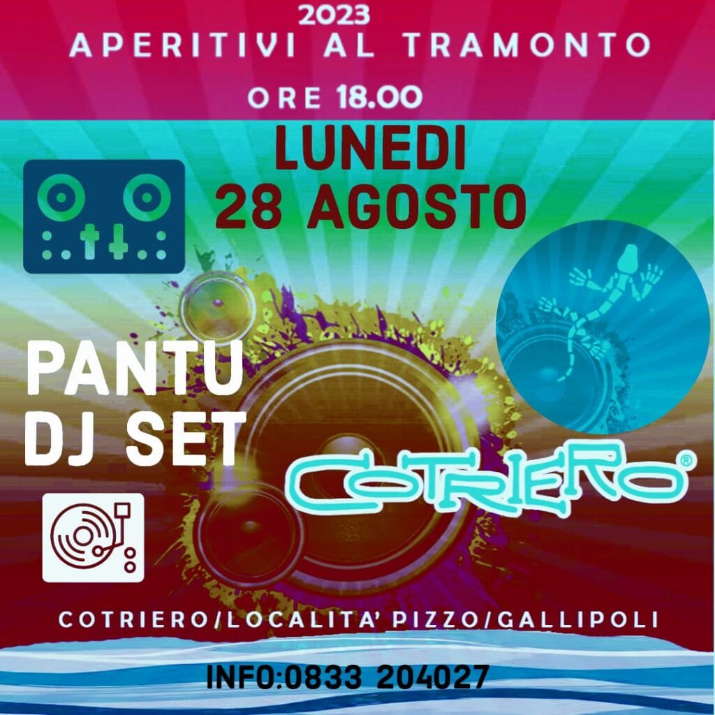 Stasera a Gallipoli, al Cotriero,località lido Pizzo, “Aperitivi al Tramonto” con il dj set di Pantu. Inizio ore 18