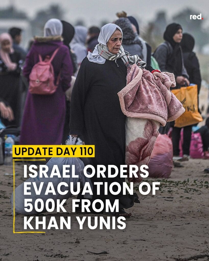 Le forze di occupazione israeliane hanno emesso ordini di evacuazione per circa 513.000 persone stipate in un’area nel sud di Gaza per fuggire altrove. L’area colpita comprende tre ospedali, che rappresentano quasi il 20% dei restanti ospedali parzialmente funzionanti nella Striscia di Gaza.