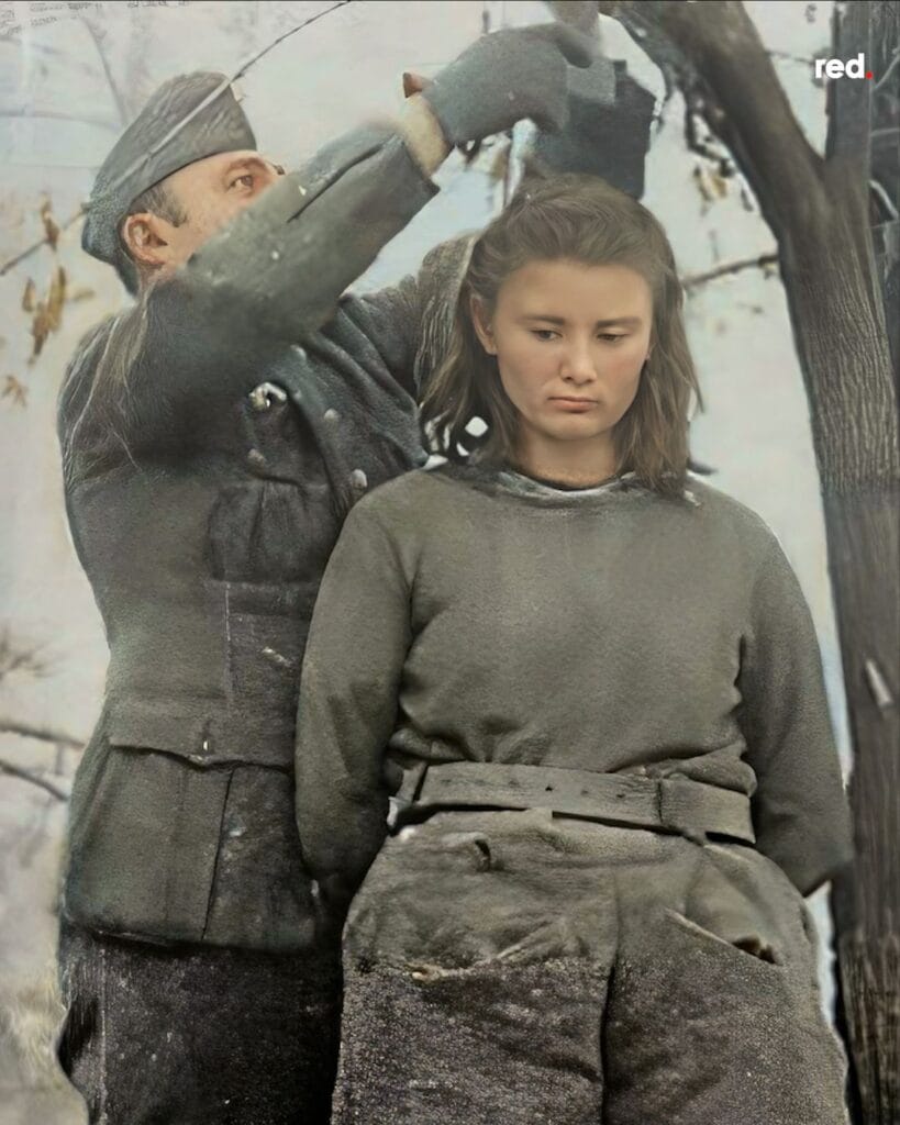 Il 8 febbraio 1943 la partigiana antinazista diciassettenne Lepa Svetozara Radić, jugoslava della Bosnia-Erzegovina, fu giustiziata dai nazisti per impiccagione. Questa fotografia (ingrandita e colorata con l’intelligenza artificiale) fu successivamente trovata sul corpo del soldato tedesco che l’aveva presa. Lepa era iscritta al Partito Comunista di Jugoslavia e combatté nell’Esercito di Liberazione Popolare della Jugoslavia. Fu insignita nel 1951 della medaglia dell’Ordine dell’ Eroe popolare.