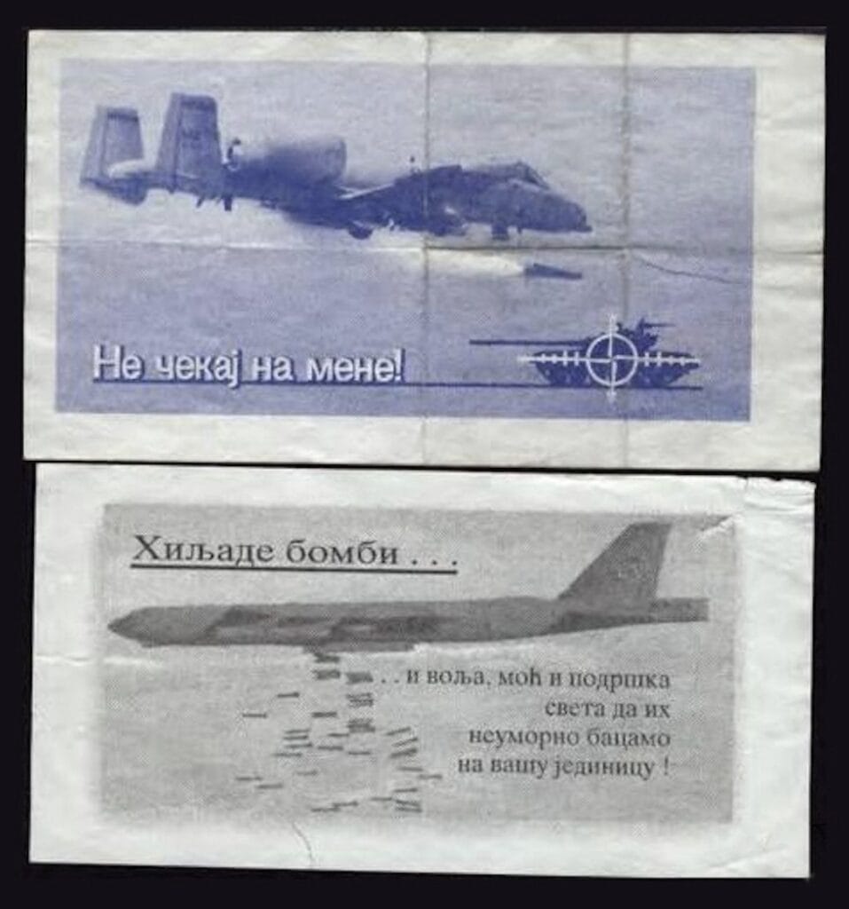 Propagandopolis, pagina social dedicata alla propaganda politica e militare contemporanea, ci illustra la storia dei volantini NATO lanciati sulle forze jugoslave durante la guerra del Kosovo del 1999; i volantini effettivamente lanciati tra aprile e maggio 1999 sono stati tradotti anche in inglese per uso interno alla Nato.