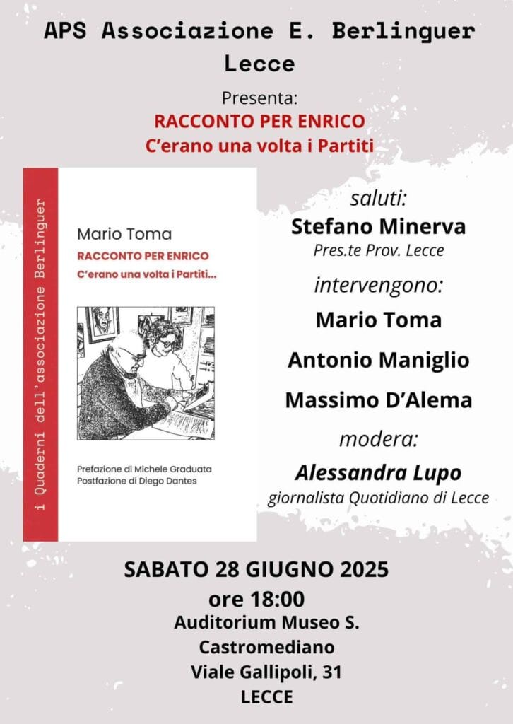 In programma oggi alle ore 18 nell’auditorium del museo Sigismondo Castromediano di Lecce, organizzato dall’associazione Enrico Berlinguer di Lecce, Mario Toma, già parlamentare del Partito Comunista italiano, introdurrà un dibattito sulla storia dei partiti italiani, dal Secondo Dopoguerra ad oggi. Una vicenda eroica ai suoi albori e man mano edulcorata nella Seconda Repubblica, che è rievocata nel libro “Racconto per Enrico. C’erano una volta i partiti” (ed. Spagine, 184 pagine, 10 euro) ed al quale parteciperà anche il presidente della Provincia Stefano Minerva. Dialogheranno con l’autore Massimo D’Alema e Antonio Maniglio .