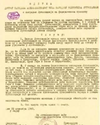 Nella sua seconda riunione, dal 21 al 29 novembre 1943, Josip Broz Tito dichiarò l’AVNOJ come autorità esecutiva superiore. Le risoluzioni della seconda riunione dell’AVNOJ furono: