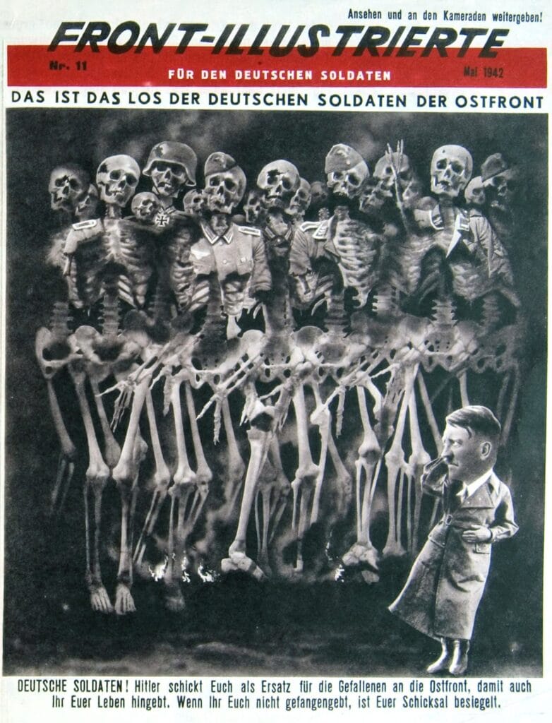 “Questo è il destino dei soldati tedeschi sul fronte orientale” è il titolo di un fotomontaggio sovietico della Seconda Guerra Mondiale (1942) che mostra Hitler con i soldati tedeschi morti.