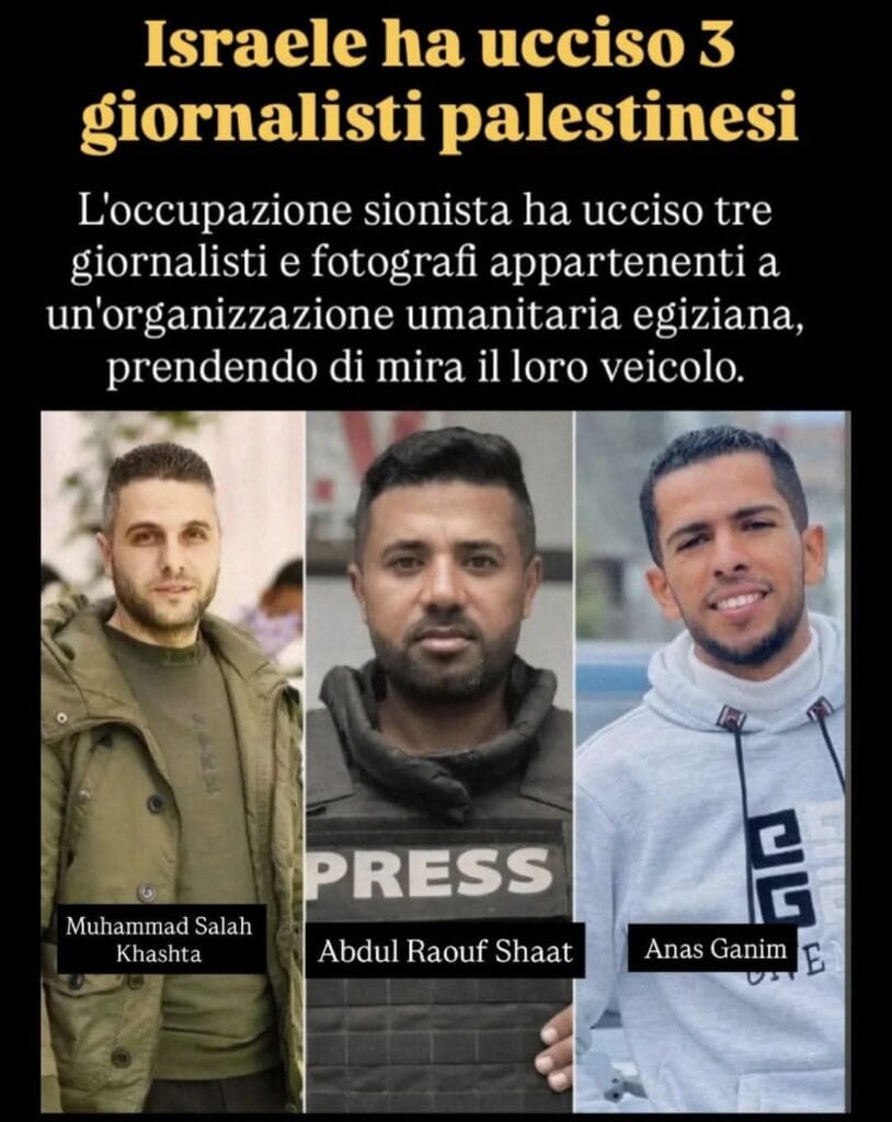 Secondo Israele il veicolo dei giornalisti avrebbe trasportato operatori di un drone di Hamas… non commento.Siamo a quasi 300 giornalisti uccisi dall’inizio del genocidio. Con sistematicità vengono presi di mira perché fanno molta più paura di un miliziano di Hamas.