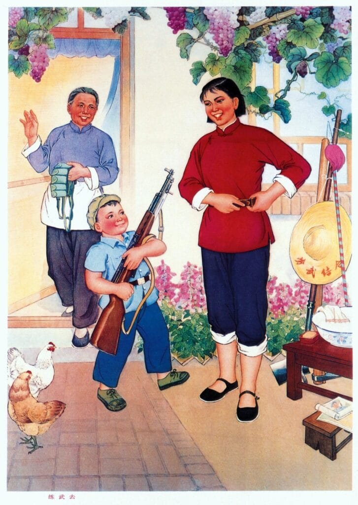 Propagandopolis, pagina social dedicata alla propaganda politica e militare propone un manifesto cinese del 1976, intitolato ‘Prepararsi per le esercitazioni militari’. Il manifesto mostra un bambino che porta alla madre il suo fucile Tipo 56 mentre si prepara per l’addestramento. La nonna porta una cintura di munizioni, mentre la scritta sul cappello a destra recita ‘Combina il lavoro agricolo con l’addestramento militare’.