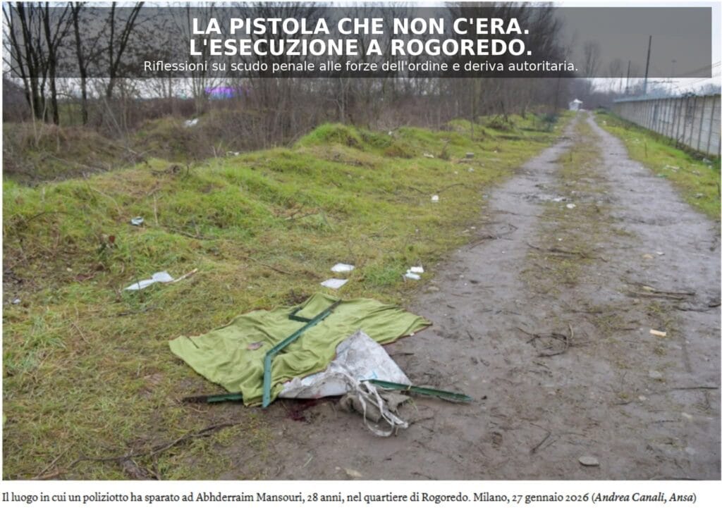 Milano, boschetto di Rogoredo. 26 gennaio, un lunedì, chiunque abbia vissuto a Milano sa bene cosa succede in quel boschetto. Una specie di zona franca dove c’è spaccio, droga e chissà che altro. Non un posto dove fare un picnic. Il luogo c’entra poco. Abderrahim Mansouri ha ventotto anni. Lo chiamano Zack. Esce dalla boscaglia nei pressi di via Impastato, nel ventre verde e buio di uno dei più noti mercati a cielo aperto della droga d’Europa. Davanti a lui, a venti metri, c’è un uomo in borghese. Poliziotto. Assistente capo del commissariato Mecenate. Un colpo solo, preciso, alla tempia destra. Zack cade. Muore.Ore dopo, in questura, il poliziotto mette a verbale: “Ci siamo qualificati dicendo: ‘fermo polizia’. E lui ha tirato fuori dalla tasca un’arma puntandomela contro”.