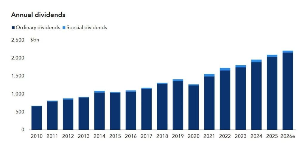 La società finanziaria Capital Group, importante asset manager a livello mondiale, compila ogni anno il “Dividend Watch”, uno studio che analizza le tendenze azionarie globali monitorando le 1.600 società più grandi al mondo, riportando la crescita dei dividendi in tutte le regioni e in tutti i settori (l’ultimo si trova qui: https://www.capitalgroup.com/content/dam/cgc/tenants/eacg/documents/2026/global-equity-study-2026-ed3.pdf). Rimandando al documento per i dettagli, qui sintetizziamo gli aspetti chiave. Nel 2025 i dividendi globali hanno registrato un aumento del 7%, raggiungendo il livello record di 2.090 miliardi di dollari e la previsione per il 2026 è 2.200 miliardi di dollari. In pratica, se si trattasse di PIL, i dividendi rappresenterebbero all’incirca la decima economia mondiale, davanti alla Spagna, al Messico e alla Corea del Sud. E non si tratta nemmeno di tutti i dividendi anche se il report li quantifica attorno all’85% del totale.