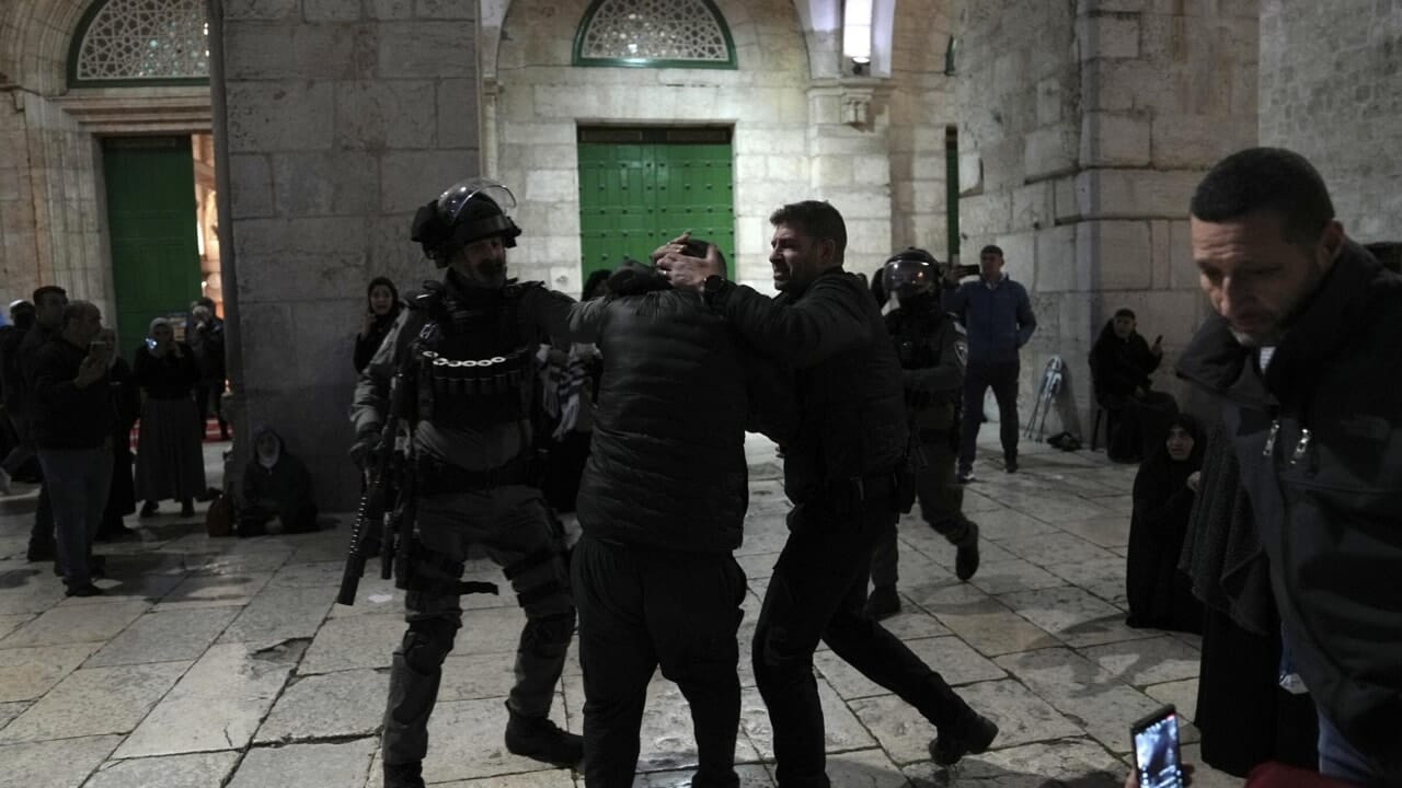 L’irruzione della polizia nella moschea di Al-Aqsa ph Lapresse (AP Photo/Mahmoud Illean)