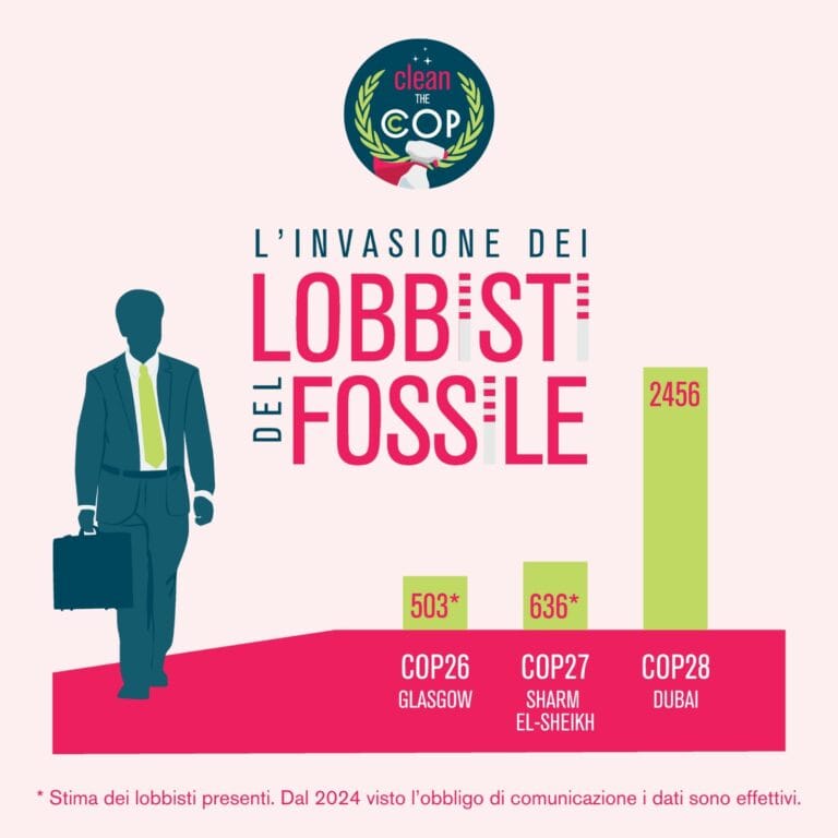 E più incalza l’emergenza climatica, più l’invasione dei lobbisti alle COP è in crescita: nel 2021 se ne stimavano circa 500 alla Cop26 di Glasgow, nel 2022 erano in 636 alla Cop27 diSharm-el-Sheikh, mentre nella Cop28 di Dubai, nel 2023 (primo anno in cui è divenuto obbligatorio per ciascun delegato rivelare l’ente di appartenenza) il numero è salito vertiginosamente a 2.456: la delegazione più numerosa di tutte.C’è di più: spesso gli accrediti dei lobbisti vengono registrati proprio dagli governi all’interno delle delegazioni governative, che sarebbero chiamate a negoziare nell’interesse generale, garantendo azioni climatiche efficaci e non facilitando la presenza di chi difende interessi palesemente in contrasto con gli obiettivi da perseguire. Un meccanismo pericoloso che vale anche per l’Italia: alla Cop28 di Dubai la maggior parte dei rappresentanti di aziende del fossile è stata accreditata dal nostro governo.