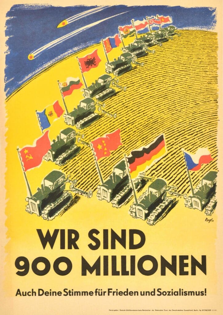 Propagandopolis propone un poster storico della DDR negli anni 50, per le elezioni.”Siamo 900 milioni, insieme alla tua voce [vota] per la pace e il socialismo!” recita il poster elettorale.