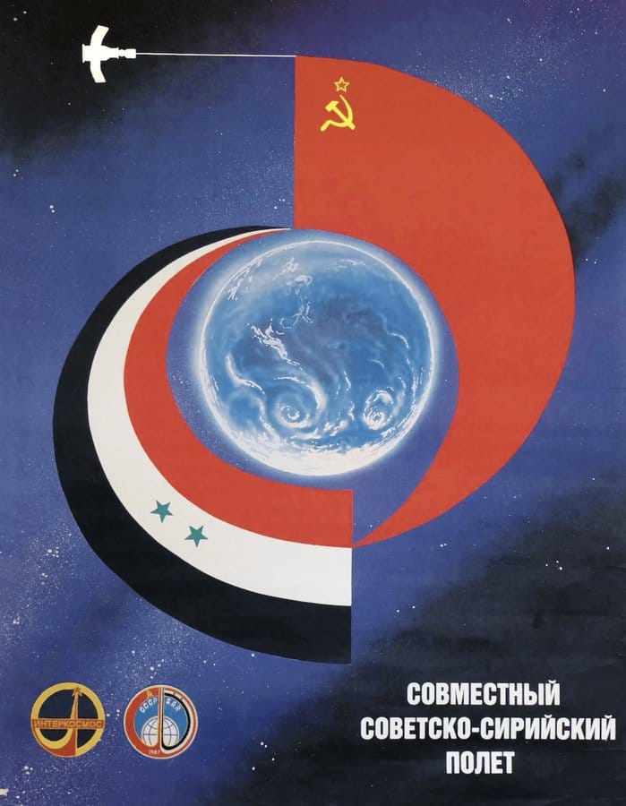 Propagandopolis, pagina social dedicata all’arte della propaganda politica moderna e contemporanea, approda in Siria, per celebrare con un poster – ed anche con un francobollo – un “Volo spaziale congiunto sovietico-siriano” . Si tratta di un poster sovietico che celebra la missione Soyuz TM-3 del 1987, che mostra le bandiere sovietiche e siriane intorno alla Terra.
