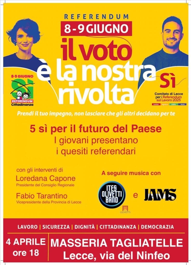 A partire dalle ore 18 alla Masseria Tagliatelle (via del Ninfeo a Lecce), è in programma un’iniziativa di presentazione dei quesiti referendari: cinque under 35 di alcune delle associazioni aderenti (Amnesty, Casa delle Donne, Cgil, Sindacato Studentesco e Udu) presenteranno un quesito ciascuno, alla presenza della presidente del Consiglio regionale, Loredana Capone, e del vicepresidente della Provincia, Fabio Tarantino.