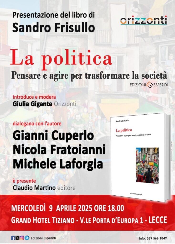 Stasera alle ore 18 all’Hotel Tiziano di Lecce, Sandro Frisullo, presidente provinciale a Lecce di Sinistra Italiana, presenta il suo ultimo libro ”La politica. Pensare e agire per trasformare la società”. Alla presentazione interverranno Nicola Fratoianni, segretario nazionale di Sinistra Italiana, Gianni Cuperlo, direzione nazionale PD e Michele Laforgia, penalista barese ed a capo dell’associazione “La giusta causa”. Introduce e modera Giulia Gigante di Orizzonti. Prevista la partecipazione dell’editore di Esperidi, Claudio Martino.