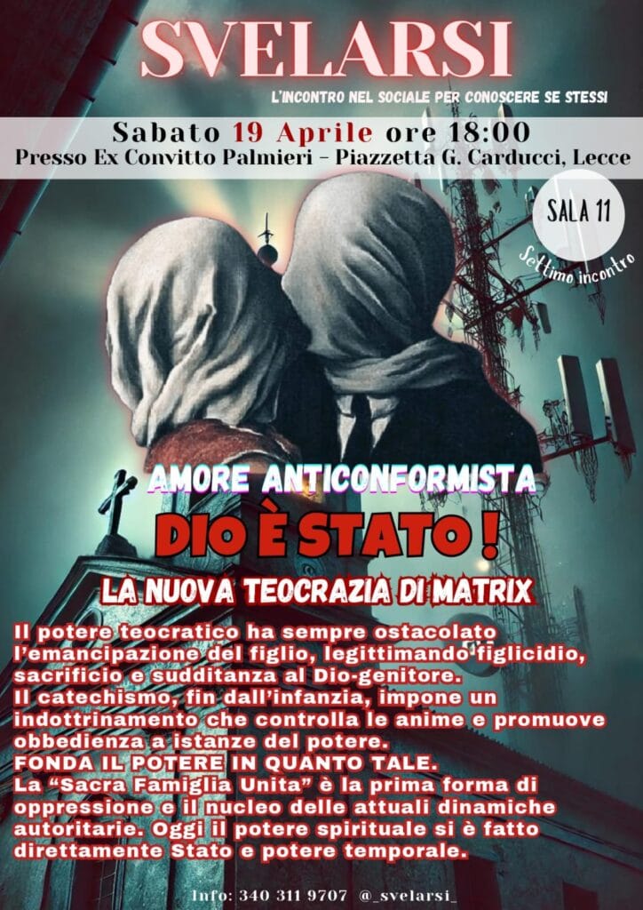 Dello stesso avviso Simone Alfarano: “Siamo giunti all’ultimo incontro del nostro percorso, lo concludiamo approfondendo il tema dell’emancipazione dalla famiglia, che rappresenta la conclusione di un processo di liberazione dall’assoggettamento che viene imposto fin dalla nascita. È fondamentale sottolineare il ruolo teocratico in questa dinamica: viene insegnata fin da subito l’obbedienza e la sottomissione ad un dio onnipotente e che l’atto d’amore supremo coincide con il sacrificio. Per riuscire a mantenere il controllo, viene alimentata la repressione del pensiero critico, rendendo sempre più difficile la possibilità di riconoscere e mettere in discussione ciò che ci opprime.