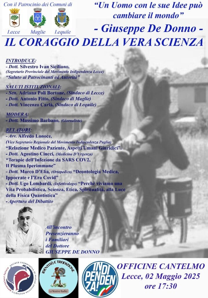 “Un uomo con le sue idee può cambiare il mondo: Giuseppe De Donno – Il coraggio della vera Scienza” è il titolo del convegno che ha avuto il patrocinio dei comuni di Lecce e Maglie (quest’ultima è la città natale di De Donno) che si terrà venerdì 2 maggio alle ore 17.30 nelle Officine Cantelmo di Lecce.